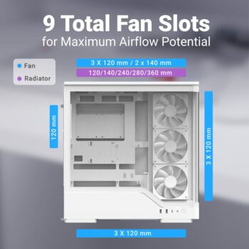 | Air Cooling | Side: 120mm x 3 (Max.) (3x 120mm Reversed ARGB PWM Fan included) Top: 120mm x 3 or 140mm x 2(Max.) Power Supply Shroud: 120mm x 2 (Max.) Rear: 120mm x 1 or 140mm x 1 (1x 120mm ARGB PWM Fan included) |